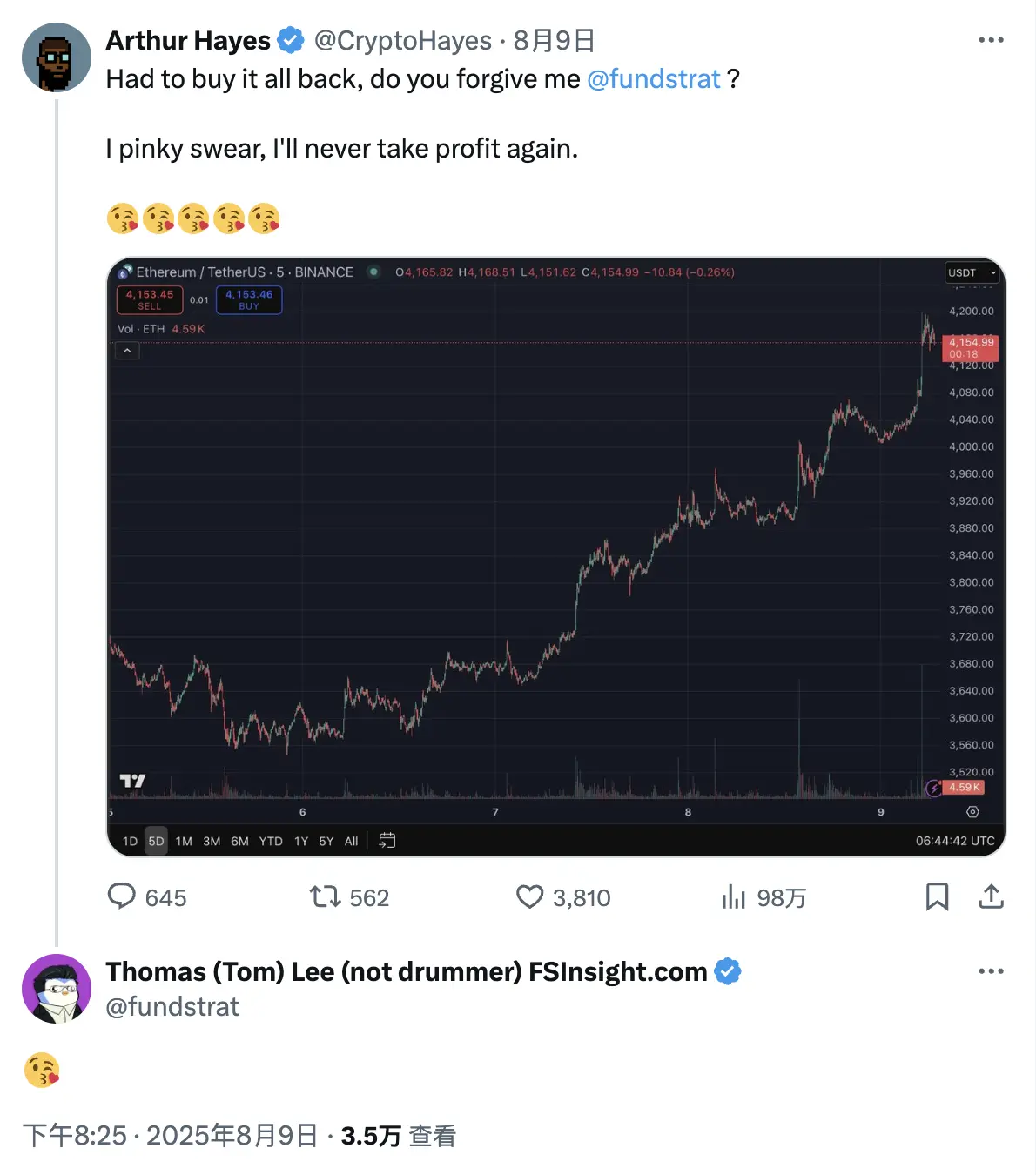 在本轮 ETH 强势上冲期间,Arthur Hayes 曾多次试图逃顶,但最终却被市场“以涨服人”,被迫提价全仓接回。