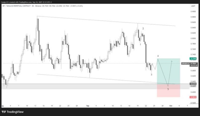 乐观币在下降通道内完成深度回调后引发市场关注。分析师Rami Scalps绘制出看涨情景,建议在0.6297美元做多,止损位0.5814美元,目标价0.7248美元。