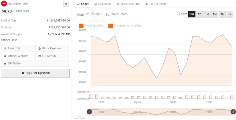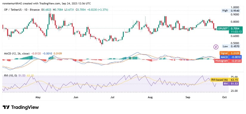从市场数据来看,OP现报0.707美元,24小时上涨3.6%。其市值保持12.4亿美元健康水平,日成交额达1.29亿美元,显示尽管遭遇抛压但流动性依然强劲。