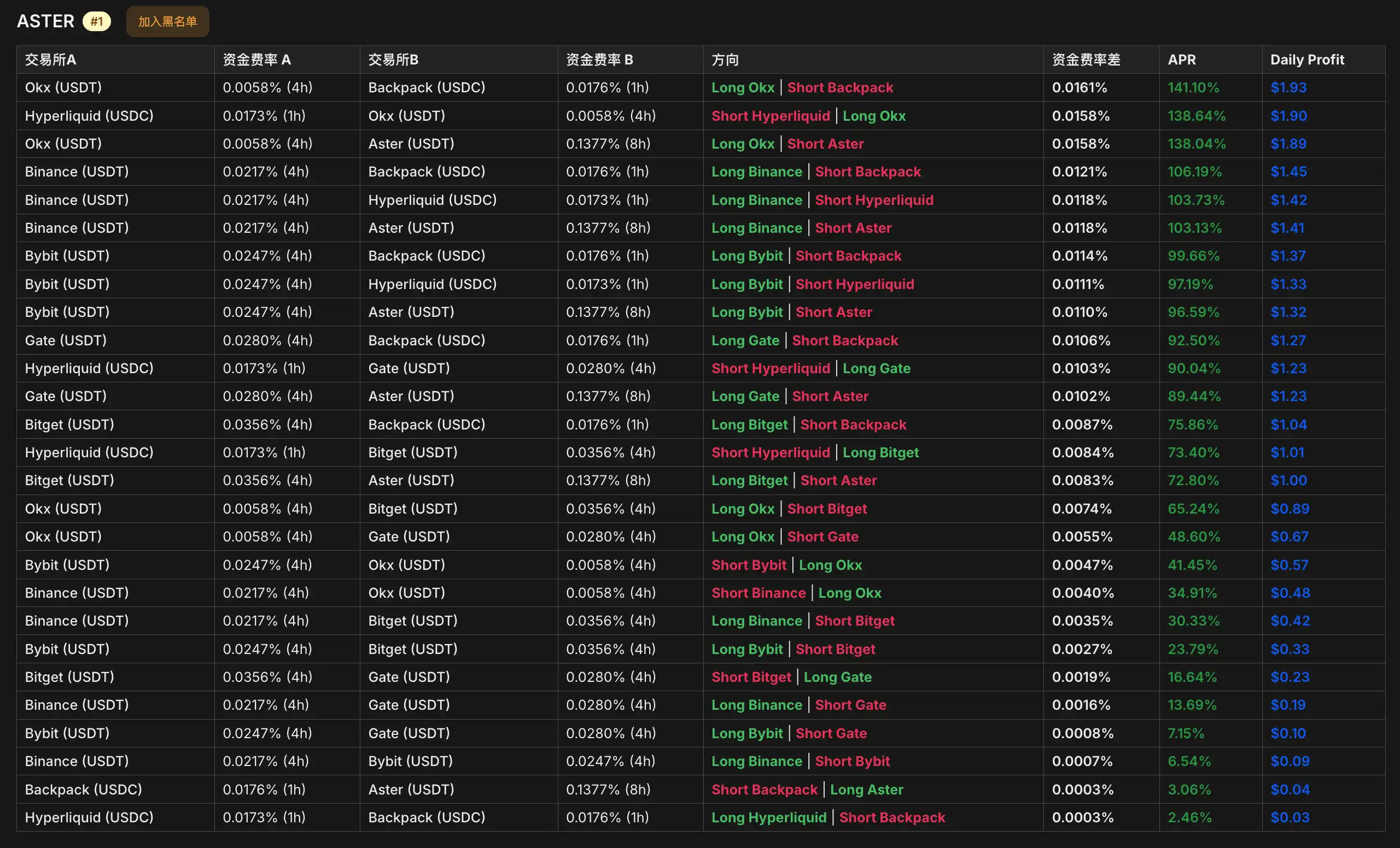 继续按照之前的 Backpack(限价挂单)+ Aster(市价吃单)方式做现货对冲,赚取积分。净收益为 = 积分价值 + 资金费率收入 - 手续费成本 - 滑点损失。