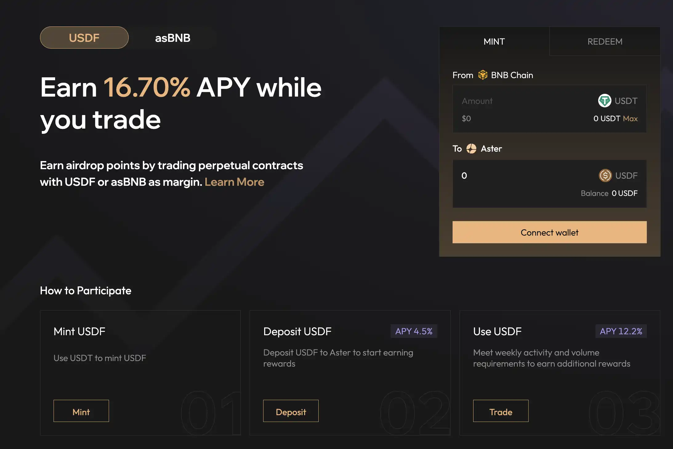 在前面讲过的对冲与资金费率策略之外,Aster 还提供了一个相对「低风险、被动收益」的玩法,就是基于 USDF 与 asBNB 的「Trade & Earn」体系。这个产品背后延续了 Aster 前身在质押资产流动性上的经验,本质上是把「交易」和「理财」结合,让用户在保持交易活跃的同时,也能享受到稳定的年化收益。