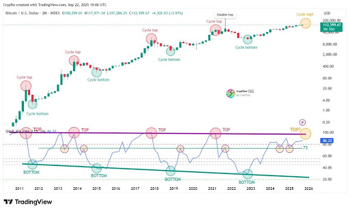 比特币(BTC)价格走势再次引发关注,因历史前高(ATH)出现前的关键指标已重现。一位加密策略师最新发布的比特币"作弊代码"显示,周期性指标与过往每次大涨完美吻合。当前BTC价格突破112,500美元之际,交易员正密切关注这种曾在前几轮牛市引爆暴涨行情的形态再度出现。