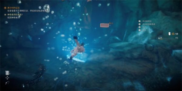 从湖泊的光亮位置潜入水底,跟随洞口进入更深的水下区域。