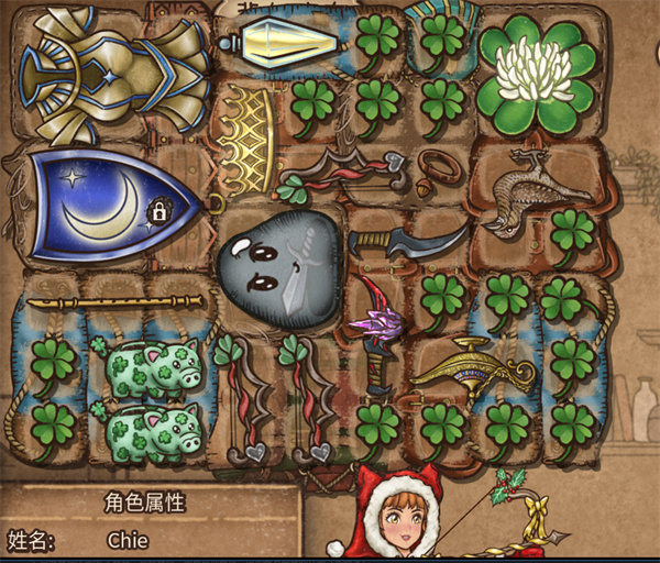 3. 如图,左上角五件套固定,确保护甲增益最大化: 神圣甲贴下方月盾、右侧神圣药水、王冠。月盾右顶钢黏,下铺一个横着往右的笛子。