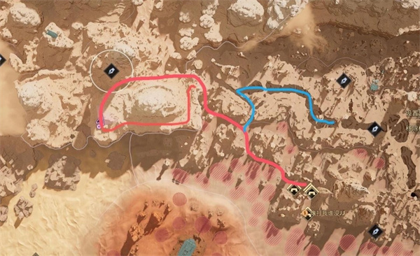 两片流沙中间有路下去直接就能看到一个资源厂,一路向下走就行。