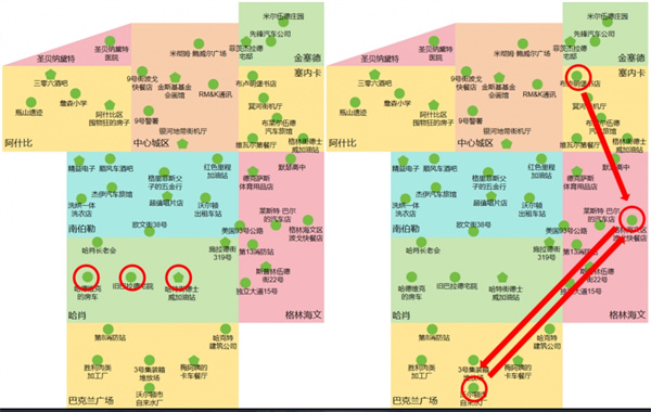 任务路线:塞内卡的【布卢明堡书店】→格林海文的【格林海文区波戈快餐店】→巴克兰广场的【沃尔顿市自来水厂】→【格林海文区波戈快餐店】