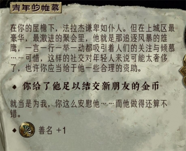 2、也可以选择给9个金币,鼓励他参加年轻人的社交活动,善名+1。