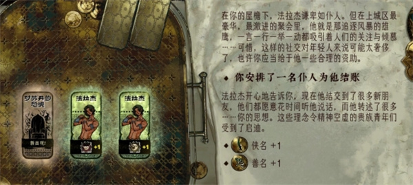 1、你可以选择给小法3个金币,这些金币足以支付他的日常开销,此时善名+1。