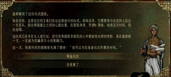 9、自动触发盖斯会卖掉祖产筹钱,选我想要,后面会有事件不限时,给钱就好,会获得“古老的戒指”,他升金后会有把戒指赎回去的事件。