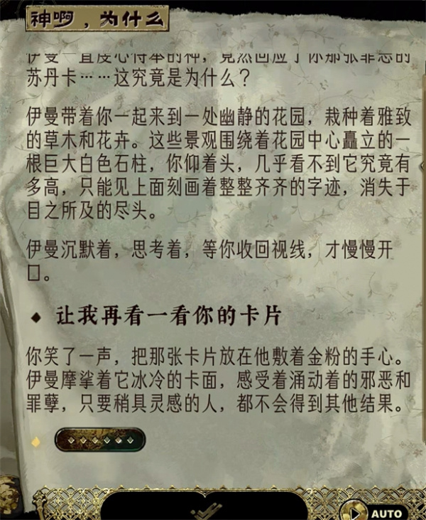 2、出现事件【神啊,为什么】这里不要全放密教的卡,且主角魅力要≥8;