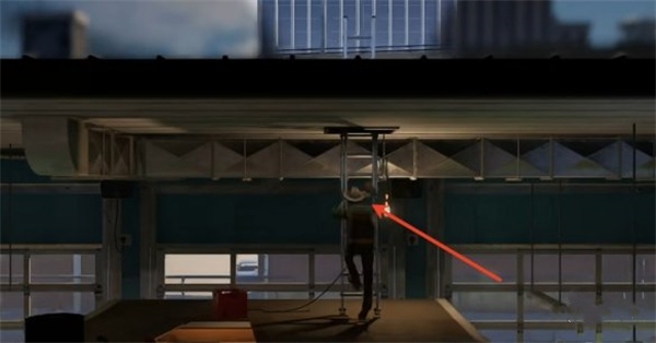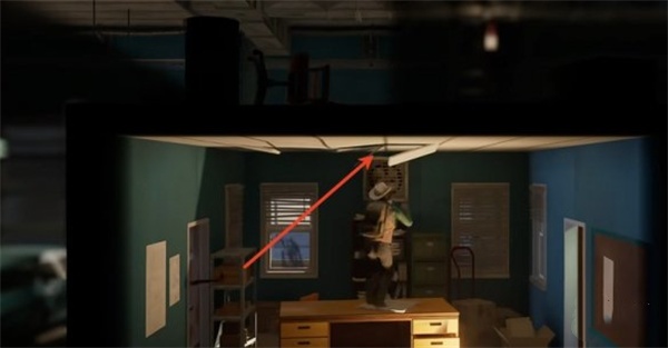 3、一直到看到有写字台桌子的屋子里后,上天窗爬上去。