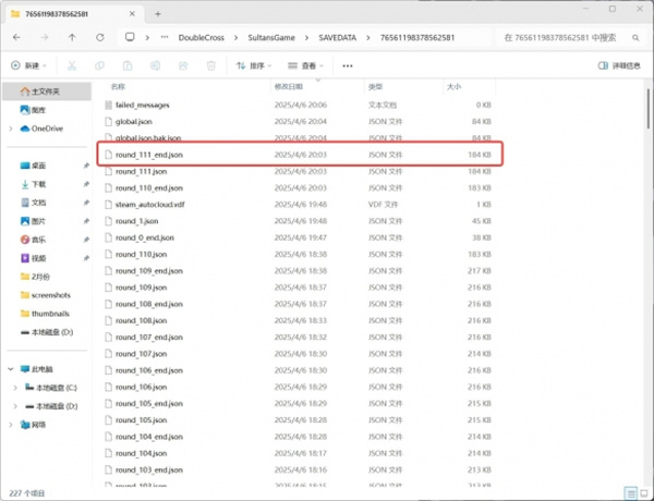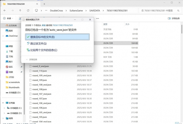 5、随便找个roundxxxend的文件,数字是轮次,按需要找,只更换结局的话找个最终轮次-2的就差不多。把这个json文件复制到桌面,改名为auto_save.json,然后再移动回文件夹,替换原文件。注意,这一步如果没有触发替换说明没有执行步骤3。