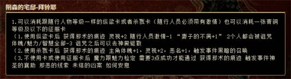 · 使用杀戮卡后,获得邪术的痕迹、主角体魄+1、灵视+2、恶名+1,触发事件黑暗的召唤。