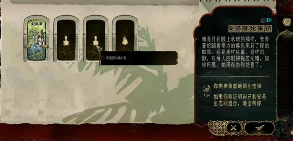2、在朝堂上对【安苏亚】用纵欲卡开启任务线,一直做到【安苏亚妃来访】;