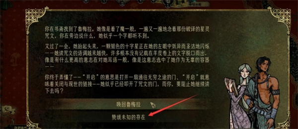 2、这里选择【赞颂未知的存在】触发【星灵之夜·二】让鲁梅拉变成星灵,后面杀女术士会帮我们。
