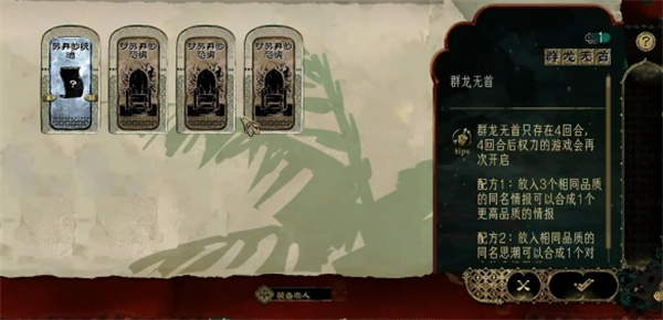 3、在朝堂上发布思潮或者获取情报,然后把情报合成高阶的卡牌;