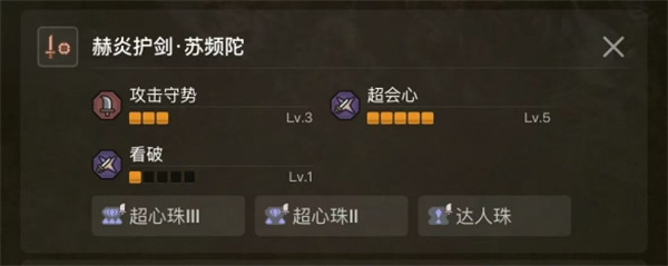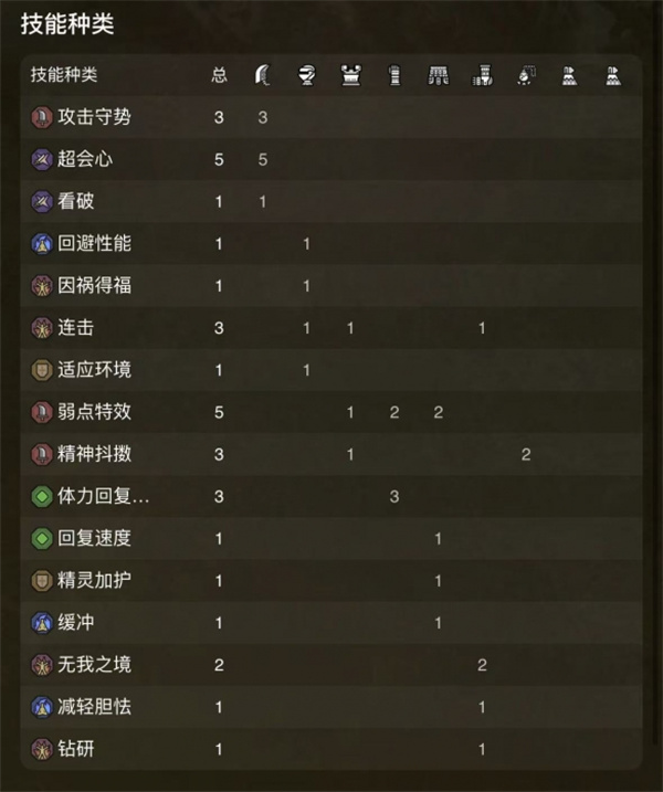 攻击守势3、超会心5、看破1、回避性能1、因祸得福1、连击3、适应环境1、弱特5、精神抖擞3、体力恢复3、回复速度1、精灵加护1、缓冲1、无我之境2、减轻胆怯1、钻研1