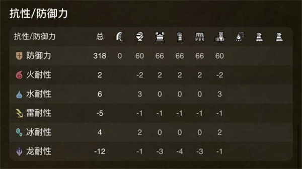 防御318、火耐2、水耐6、雷耐-5、冰耐4、龙耐-12