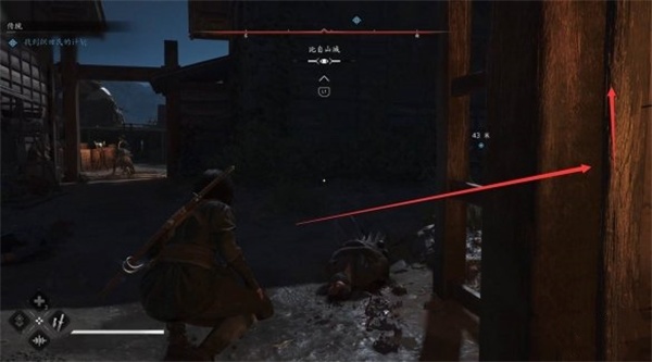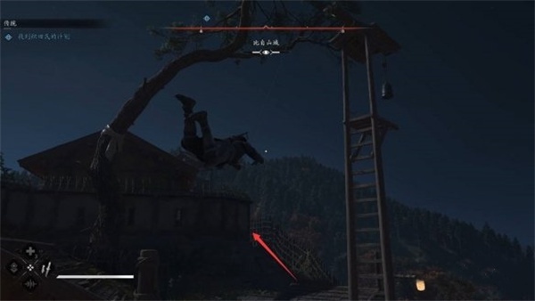 然后我们使用钩绳跳到右边,并从右边潜入营地。