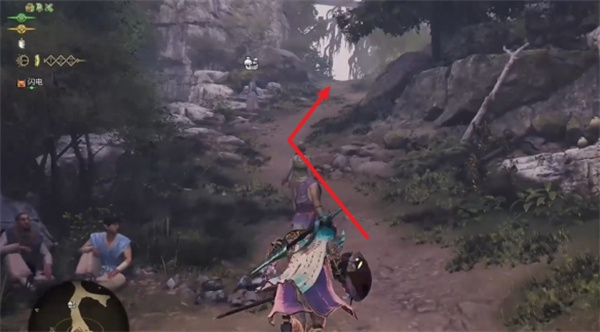 传送过来后向上走,按下图所示路径就能找到素材采集委托「阿帕尔」。