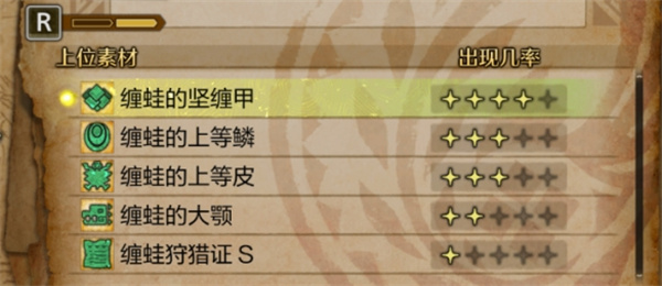 1、缠蛙的上等皮是上位缠蛙狩猎中可以获得的材料。