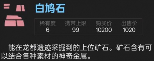 1、白鸠石是怪物猎人荒野龙都遗迹地区中上位矿脉中的一种矿石。
