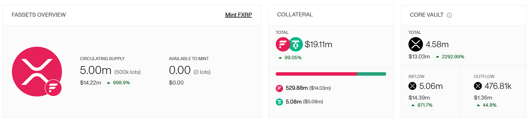FAssets仪表板数据显示项目爆发速度:FXRP流通量已达500万枚,分为50万批次,总价值1422万美元。所有铸造额度首周即告罄。