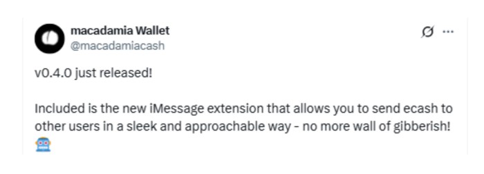 基于Cashu的闪电网络钱包Macadamia已发布0.4.0版本,用户现可直接在聊天中发送"电子现金"$BTC。