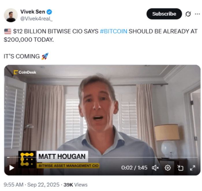 Bitwise首席投资官Matthew Hougan重申其大胆观点:比特币被严重低估,合理价位应接近20万美元。