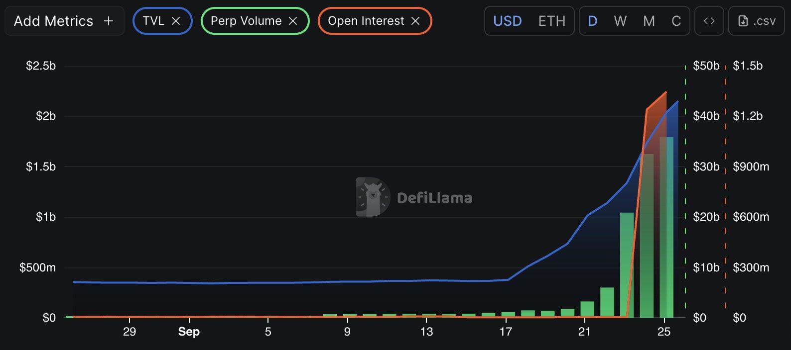 与此同时,Aster 的未平仓合约 (OI) 飙升了约 33 倍(9 月 24 日从 370 万美元飙升至 13 亿美元),TVL 在 30 天内飙升了约 500%。相比之下,Hyperliquid 同期的指标则呈现出稳定、自然的模式。