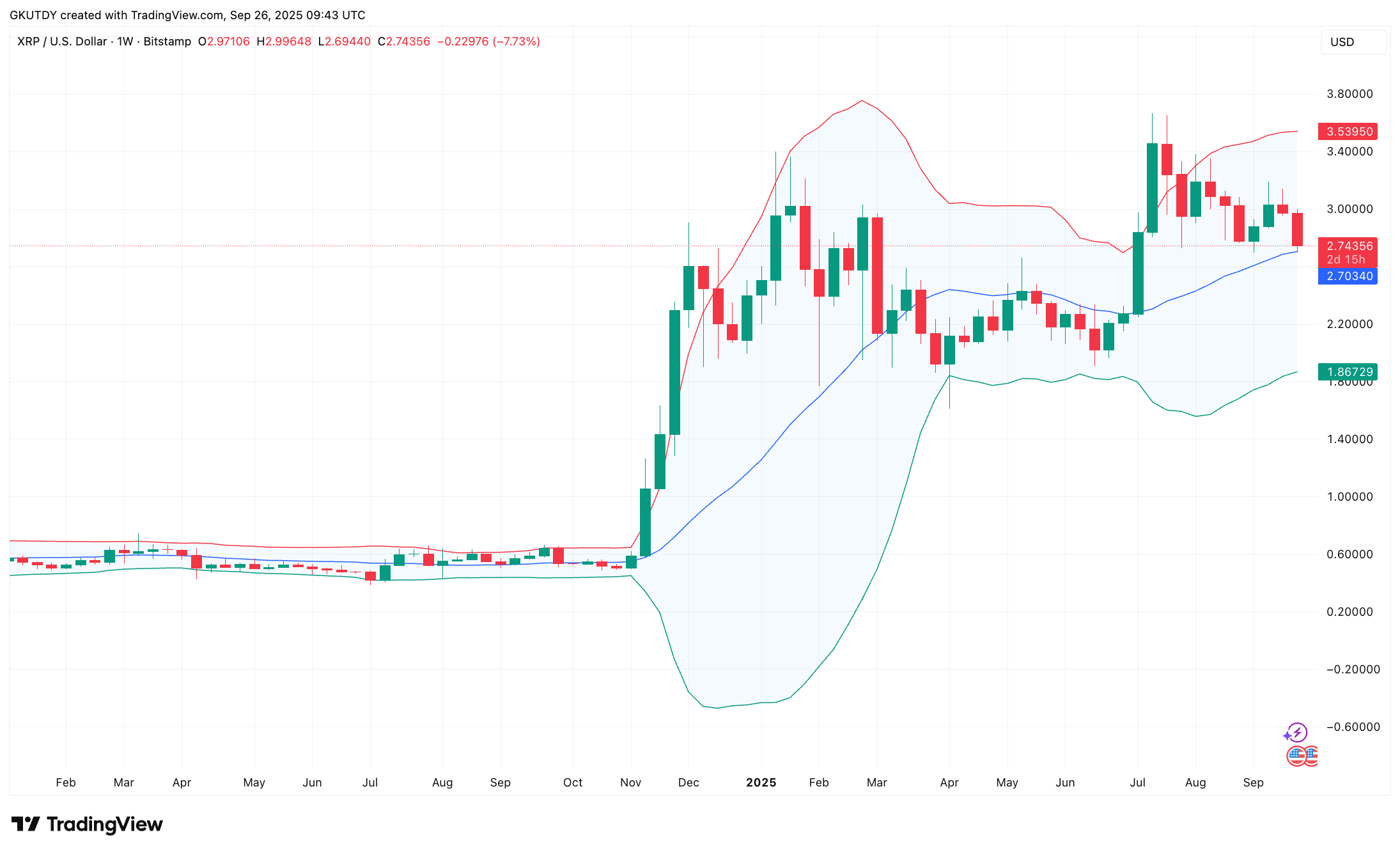 周线图却传递出截然不同的信号。布林带显示XRP始终紧贴2.76美元的中轨线,只要该支撑位不破,上行趋势就将延续。下轨位于1.86美元,上轨看至3.54美元,而代币价格始终坚守中轨阵地。