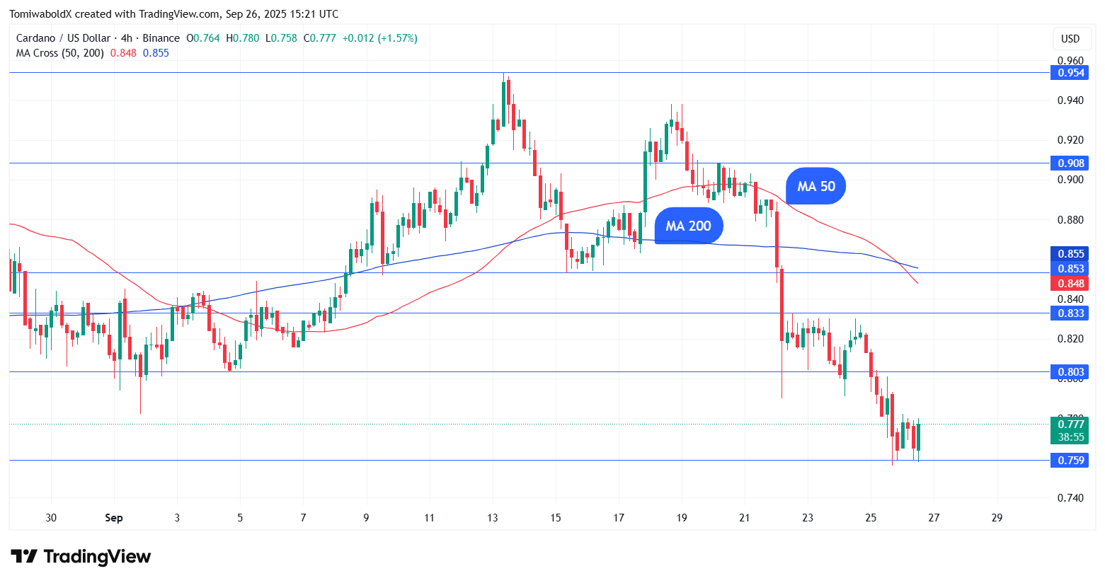 自9月19日触及0.937美元高点后,Cardano持续走低,周四更跌至0.754美元低位。