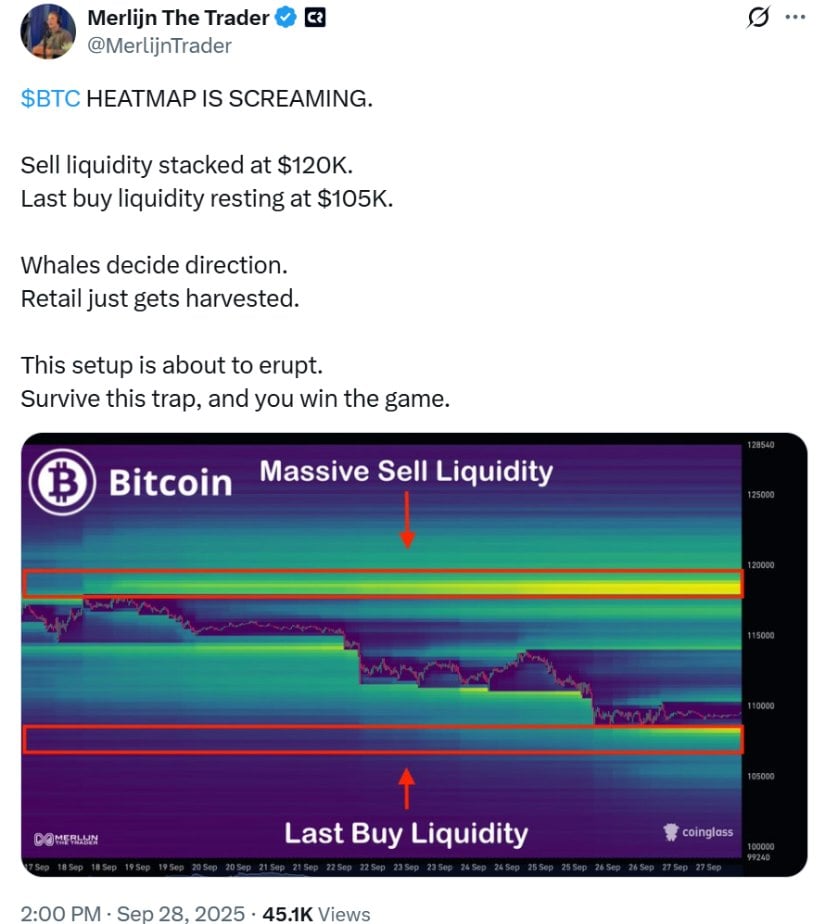 交易员Merlijn在近期发文中强调这一格局,指出120K美元堆积卖盘流动性,105K美元则聚集买盘流动性。他认为鲸鱼正主导市场方向,而散户极易遭遇流动性清洗。