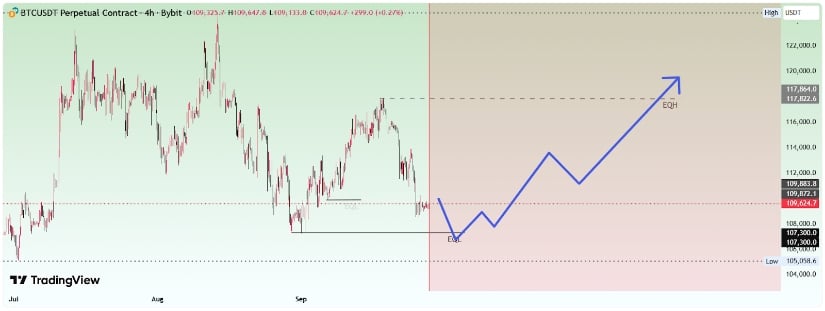 短周期图表显示BTC在117,000美元遭拒后形成看涨旗形。4小时图显示110K美元下方需求区至关重要,成功防守或触发反弹冲击前高,反之将引发100,000美元附近流动性清洗。