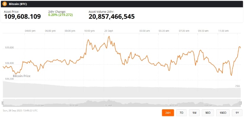 截至发稿,比特币(BTC)报价109,608美元,24小时上涨0.20%。来源:Brave New Coin比特币价格指数