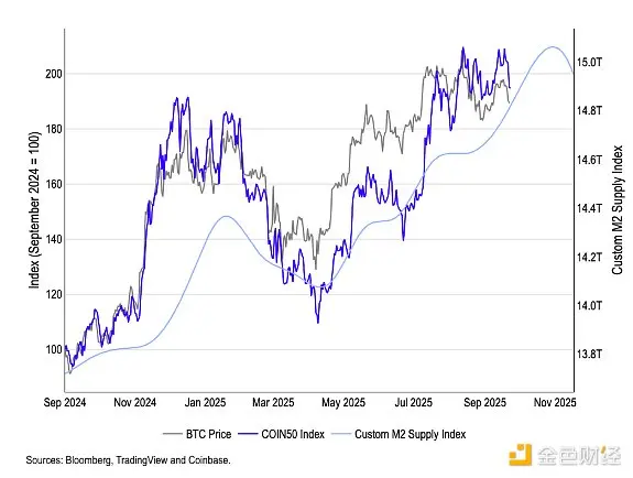 从更全球的角度来看,Coinbase定制的M2流动性指数表明,流动性逆风将从11月开始出现。我们定制的全球M2流动性指数(该指数优化了货币供应量增长,全球M2供应量领先比特币110天)从11月开始向下拐点。由于该指数在1个月至3年的时间范围内与BTC的相关性约为0.9,我们认为拐点很可能预示着年底将出现流动性逆风(图1)。然而,该指数也表明10月份流动性状况良好,这可能在短期内支撑风险资产。