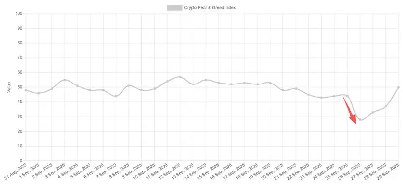 其他主流币则表现分化。 SOL 表现较为稳健,周跌幅仅 2% ,收 182 美元; XRP 跌幅超 6% ,收 2.75 美元; BNB 则在 970 美元附近震荡,跌幅约 4% 。加密货币恐惧与贪婪指数从周初中性 50 骤降至恐慌 28 ,周末小幅回升至 37 ,情绪有所企稳。