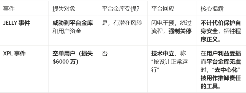 双重标準的利益计算逻辑:这种截然不同的处理方式暴露了清晰的利益计算公式:JELLY 事件威胁平台金库,触发干预;XPL 事件仅损害使用者利益且平台金库未受损,选择忽视。平台自身的资金安全始终是第一优先级,所谓的去中心化原则只是在不威胁平台核心利益时的装饰品。使用者的 6000 万美元损失在平台眼中只是「市场风险」,而平台的潜在损失则需要通过破坏去中心化来紧急救援。