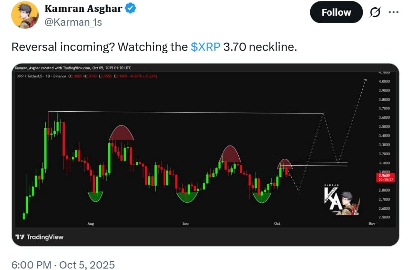 分析师正密切关注XRP在3.70美元颈线位的潜在看涨反转信号。来源:@Karman_1s via X
