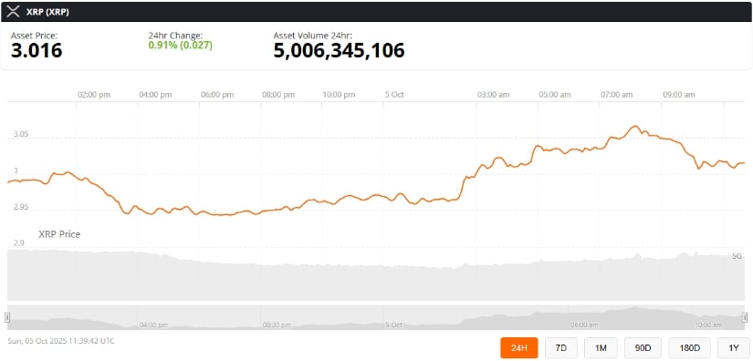 根据Brave New Coin数据,XRP在2025年10月5日亚洲早盘交易中重新站上3美元关口,此前一次高成交量洗盘清除了过度杠杆头寸。这一走势迅速获得鲸鱼和散户交易者的强烈买盘兴趣。