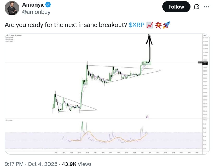分析师@amonbuy强调XRP潜在突破机会,指出长期图表显示3美元附近上升三角形形态正释放看涨动能。来源:Amonyx via X