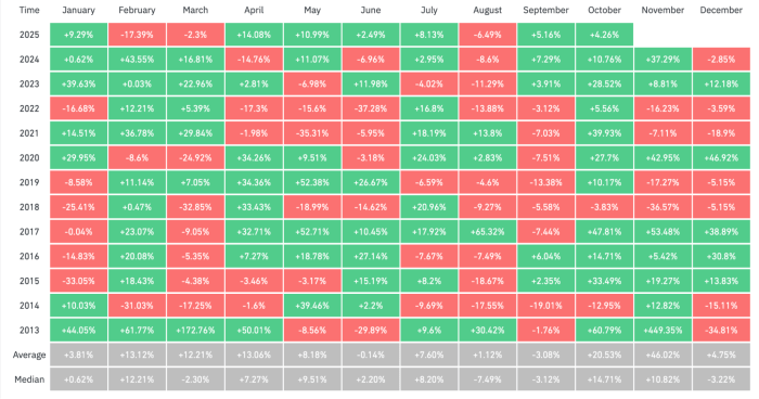 历史数据显示,十月是$BTC的"幸运月"。Coinglass统计显示过去12年中,比特币有10年在十月实现上涨。