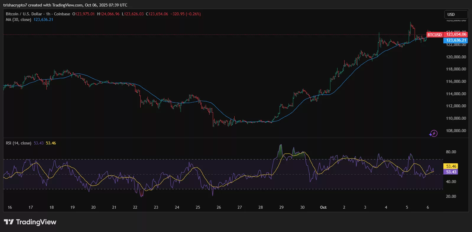 这种稀缺性往往成为价格上涨的催化剂。TradingView数据显示,BTC现报123,610美元,略低于125,506美元的历史高点。自九月下旬以来,BTC始终保持在30日移动均线上方强势运行。