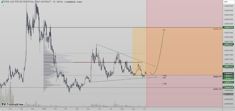 PEPE在0.618斐波那契支撑位附近持续盘整,若阻力位与成交量配合将预示看涨突破。来源:TradingView上的The Alchemist Tr