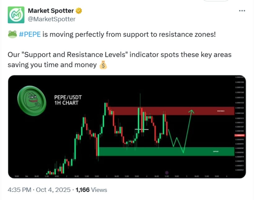PEPE在关键支撑与阻力区间稳健震荡。来源:X平台@Market Spotter