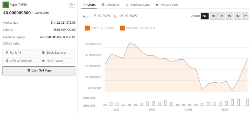 截至撰稿时,Pepe现报0.0000096美元附近,市值超40亿美元且日交易量活跃。