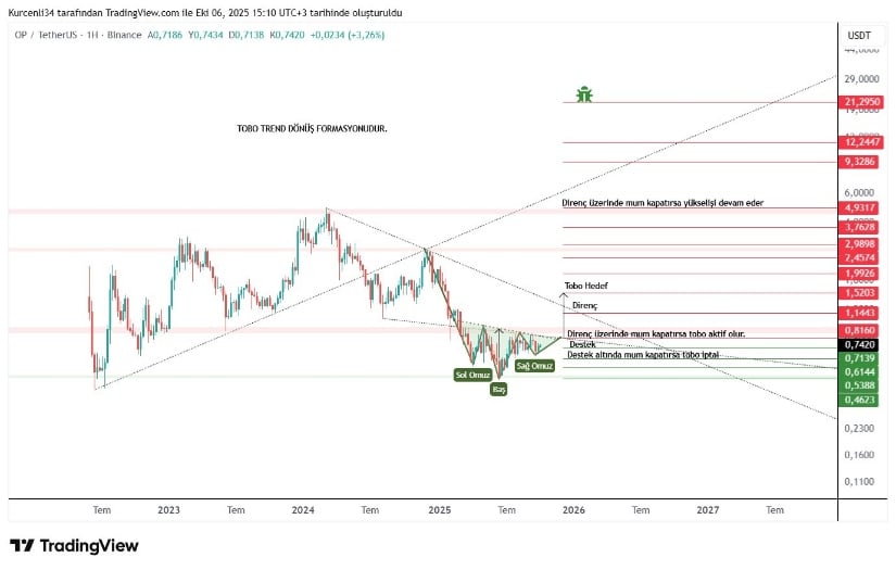 分析师Filiz在最近的X推文中指出,Optimism正在形成TOBO(头肩底)形态——这是经典的趋势反转形态,可能标志着当前下跌趋势的终结。图表清晰显示出左肩、头部和右肩结构,表明市场结构正向潜在看涨动能转变。