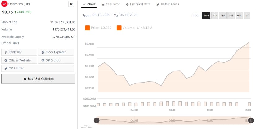 市场数据显示,Optimism现报0.75美元,24小时涨幅2.85%。其市值达13.4亿美元,日交易量1.7527亿美元,反映在连续区间震荡后投资者兴趣重新升温。