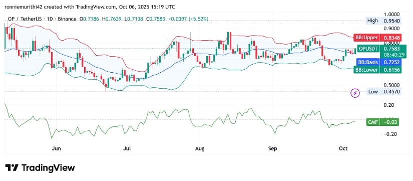 截至撰稿时,OP交易价约0.7559美元,正接近布林带中轨——该区域通常被视为多空阶段的平衡点。即时阻力位于上轨0.8346美元附近,若买盘动能未能增强,交易者预计此处将出现更大抛压。