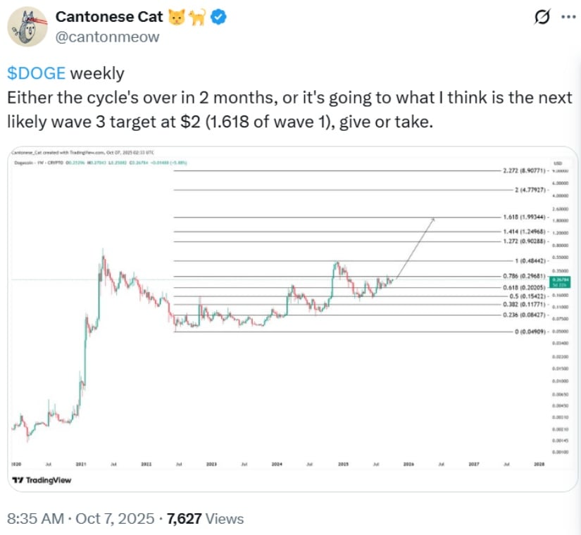 DOGE周线图显示当前周期或于两月内结束,亦可能延伸至2美元附近的第三浪目标。来源:推特@Cantonese Cat